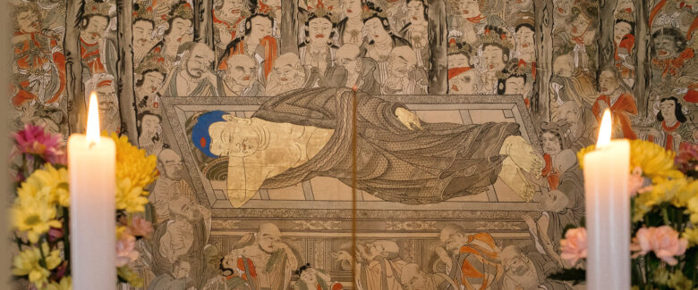 お釈迦さまは、最初の説法の時にはアンニャーシ・コンダンニャを悟らせ、最後の説法ではスバッダを悟らせました。このように、そのご生涯において、ゆかりある者をことごとく悟らせ、すべてをなし終えた今、沙羅双樹の間に静かに横たわり、最後の時を迎えようとしておられました。その夜は、ひっそりとして寂しく、あたりは静まり返っておりました。お釈迦さまは、傍らの弟子たちに、教えの要を簡潔にお説きになりました。